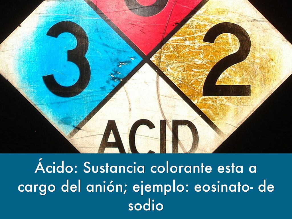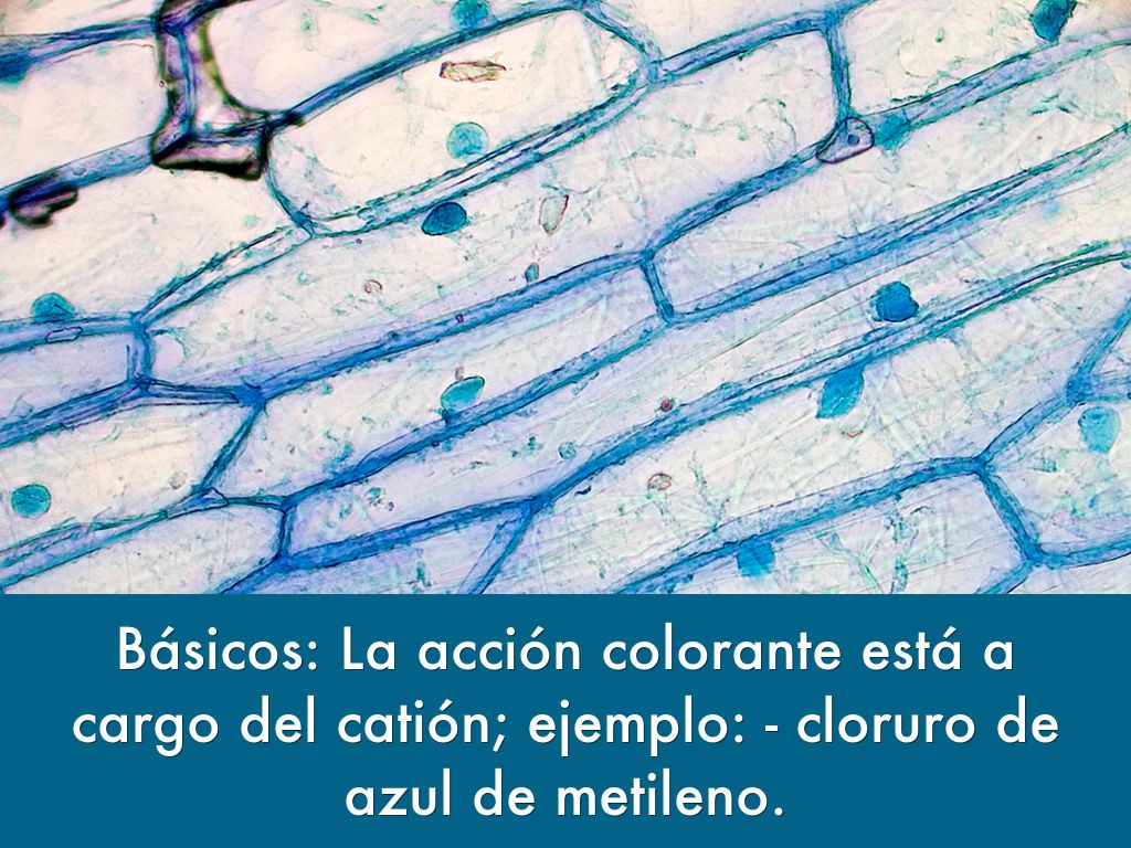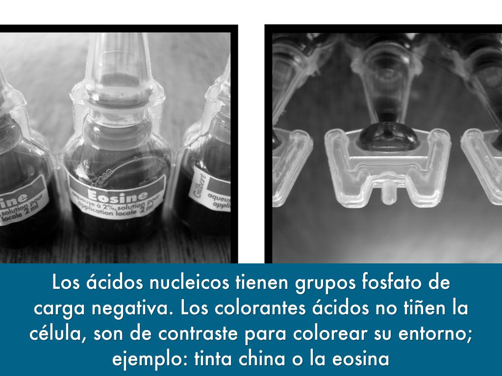 Los ácidos nucleicos tienen grupos fosfato de carga negativa. Los colorantes ácidos no tiñen la célula, son de contraste para colorear su entorno; ejemplo: tinta china o la eosina