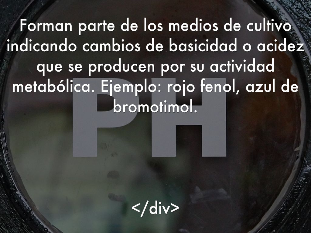 Forman parte de los medios de cultivo indicando cambios de basicidad o acidez que se producen por su actividad metabólica. Ejemplo: rojo fenol, azul de bromotimol.