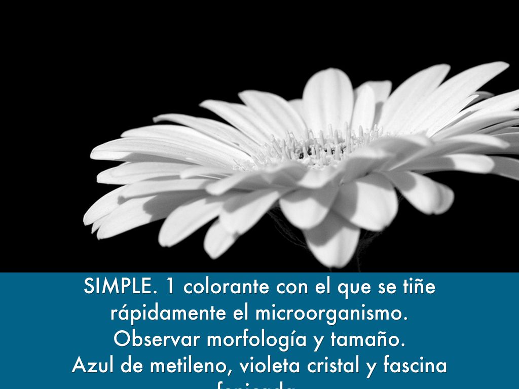SIMPLE. 1 colorante con el que se tiñe rápidamente el microorganismo. Observar morfología y tamaño. Azul de metileno, violeta cristal y fascina fenicada.