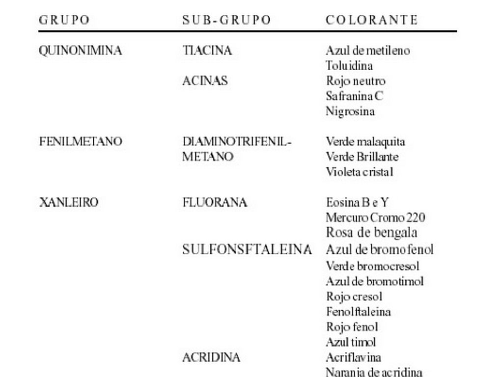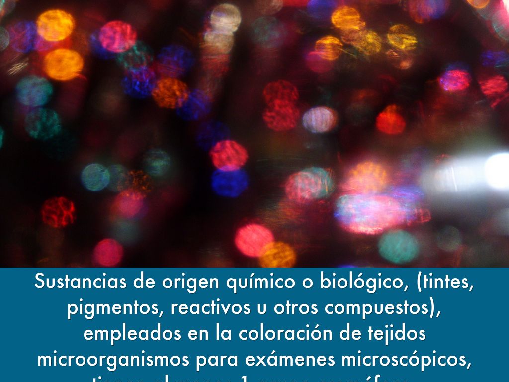 Sustancias de origen químico o biológico, (tintes, pigmentos, reactivos u otros compuestos), empleados en la coloración de tejidos microorganismos para exámenes microscópicos, tienen al menos 1 grupo cromóforo.