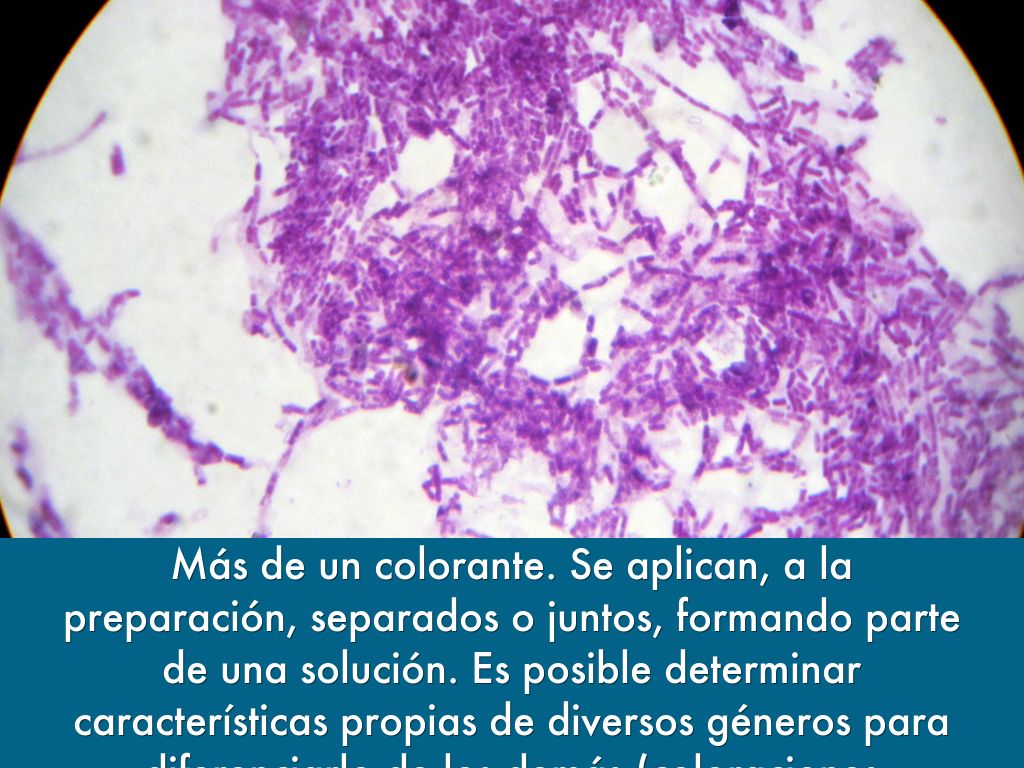 Más de un colorante. Se aplican, a la preparación, separados o juntos, formando parte de una solución. Es posible determinar características propias de diversos géneros para diferenciarlo de los demás (coloraciones diferenciales). Gram y Ziehl Neelsen.