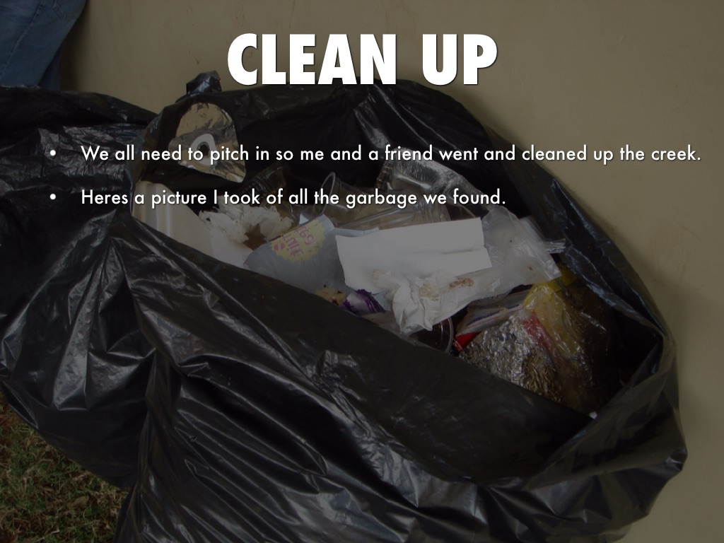 • We all need to pitch in so me and a friend went and cleaned up the creek.