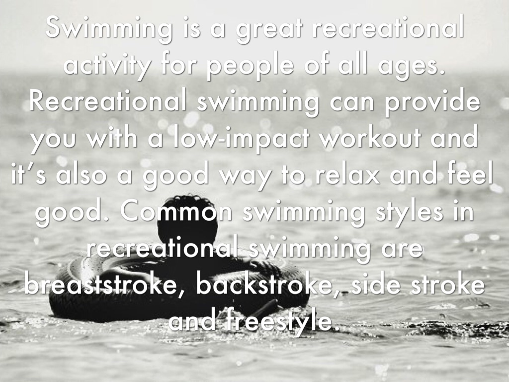 Swimming is a great recreational activity for people of all ages. Recreational swimming can provide you with a low-impact workout and it’s also a good way to relax and feel good. Common swimming styles in recreational swimming are breaststroke, backstroke, side stroke and freestyle.