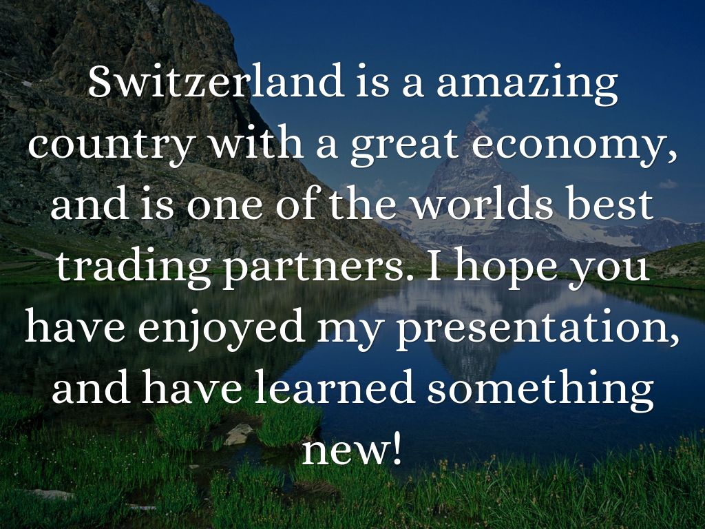 Switzerland is a amazing country with a great economy, and is one of the worlds best trading partners. I hope you have enjoyed my presentation, and have learned something new!