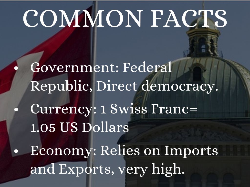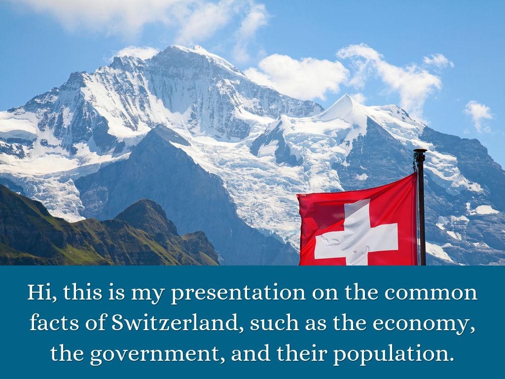 Hi, this is my presentation on the common facts of Switzerland, such as the economy, the government, and their population.