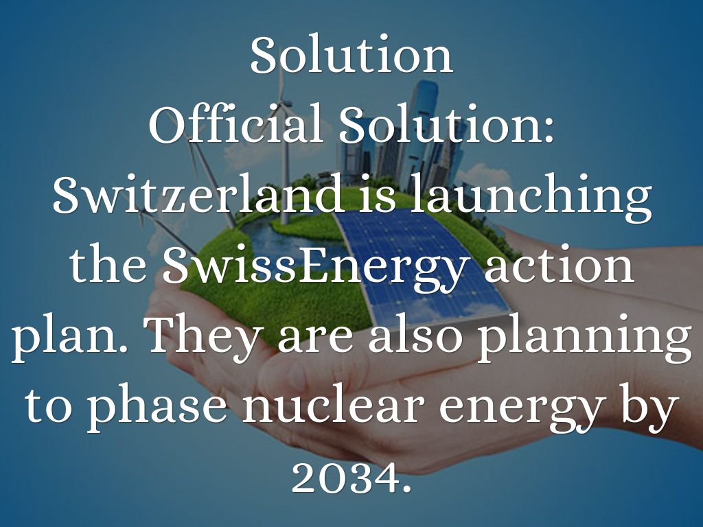 Official Solution: Switzerland is launching the SwissEnergy action plan. They are also planning to phase nuclear energy by 2034.