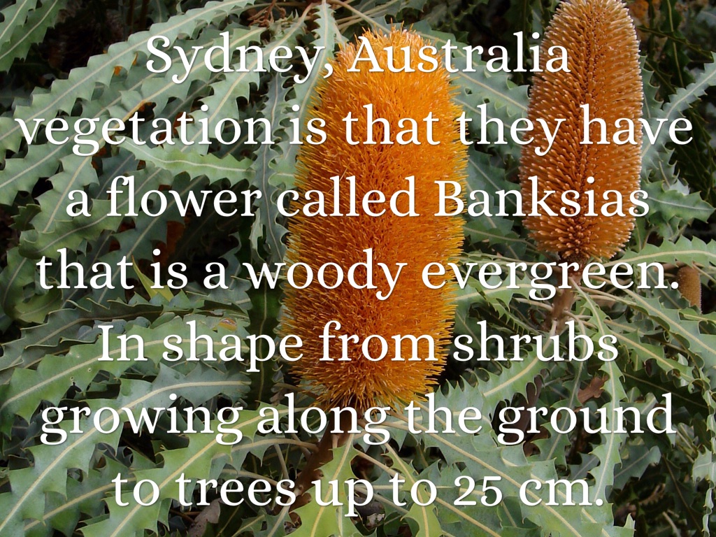 Sydney, Australia vegetation is that they have a flower called Banksias that is a woody evergreen. In shape from shrubs growing along the ground to trees up to 25 cm.