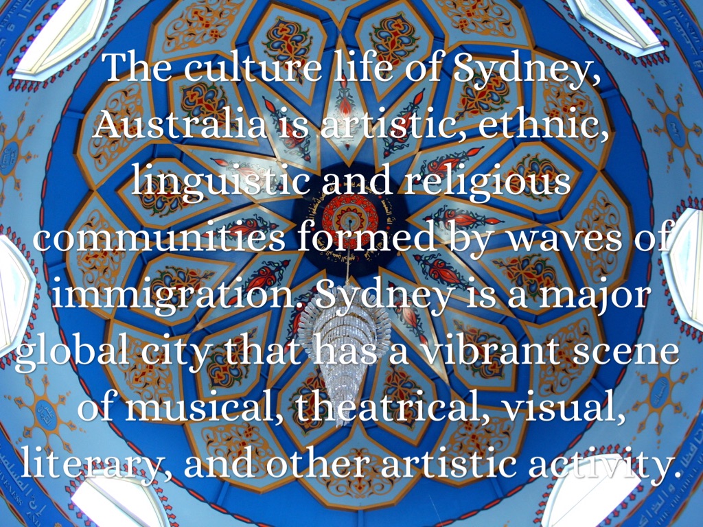 The culture life of Sydney, Australia is artistic, ethnic, linguistic and religious communities formed by waves of immigration. Sydney is a major global city that has a vibrant scene of musical, theatrical, visual, literary, and other artistic activity.