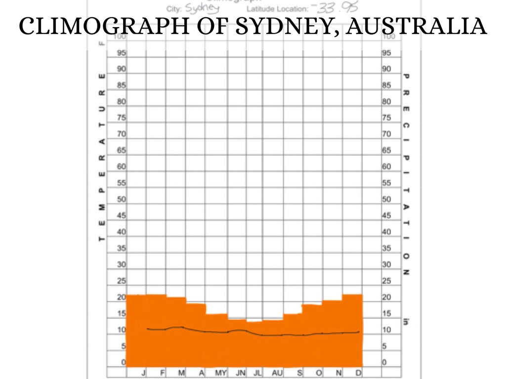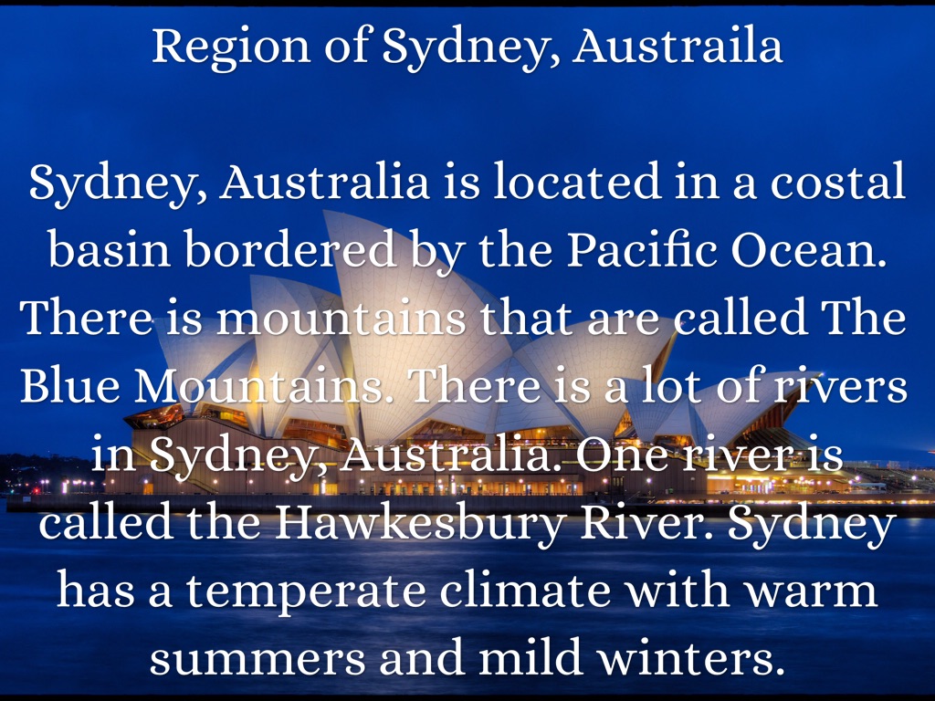 Sydney, Australia is located in a costal basin bordered by the Pacific Ocean. There is mountains that are called The Blue Mountains. There is a lot of rivers in Sydney, Australia. One river is called the Hawkesbury River. Sydney has a temperate climate with warm summers and mild winters.