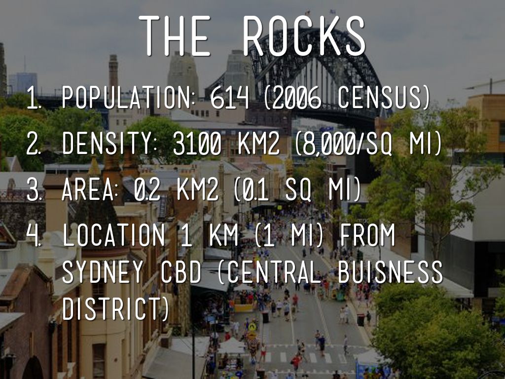 Location 1 km (1 mi) from sydney CBD (central buisness district)