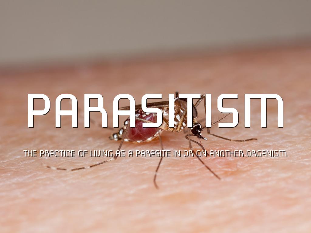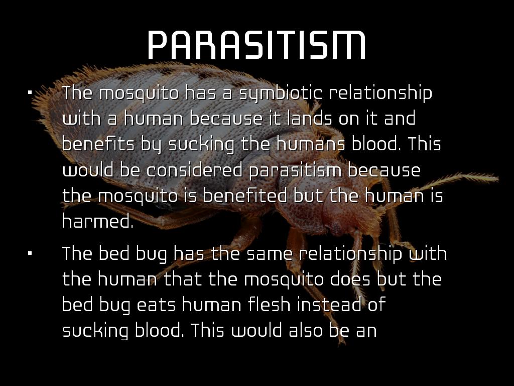 The bed bug has the same relationship with the human that the mosquito does but the bed bug eats human flesh instead of sucking blood. This would also be an example of parasitism.