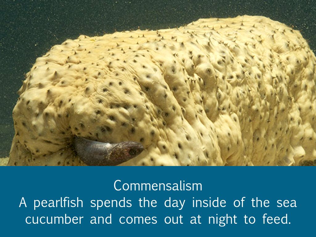 A pearlfish spends the day inside of the sea cucumber and comes out at night to feed.