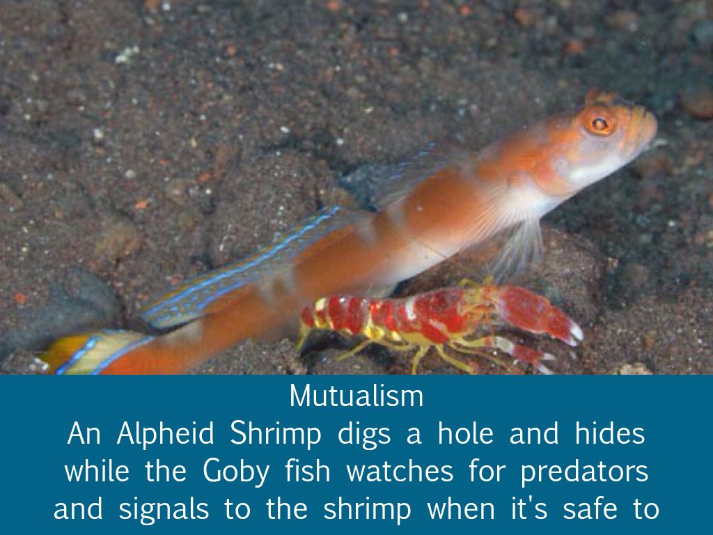 An Alpheid Shrimp digs a hole and hides while the Goby fish watches for predators and signals to the shrimp when it's safe to come out.