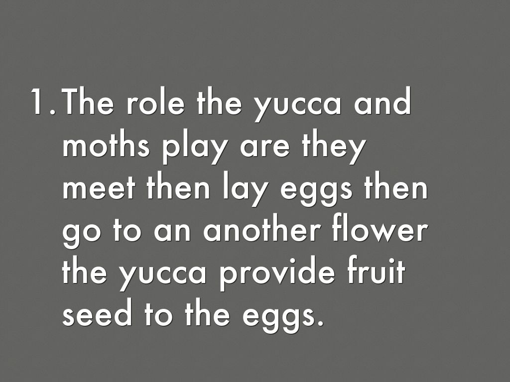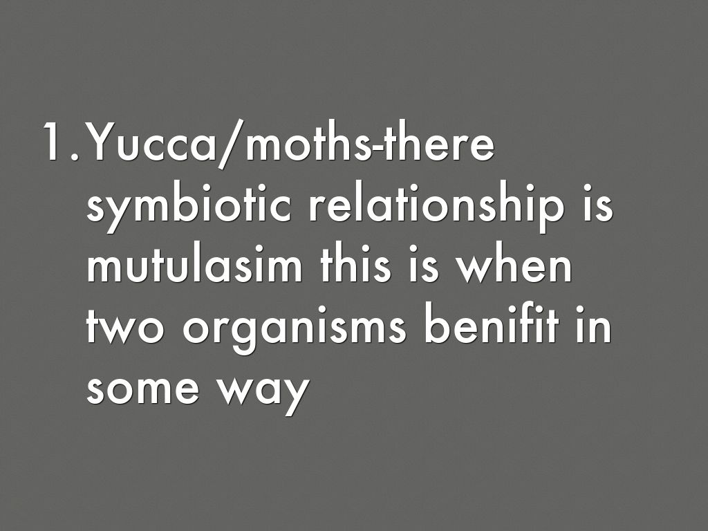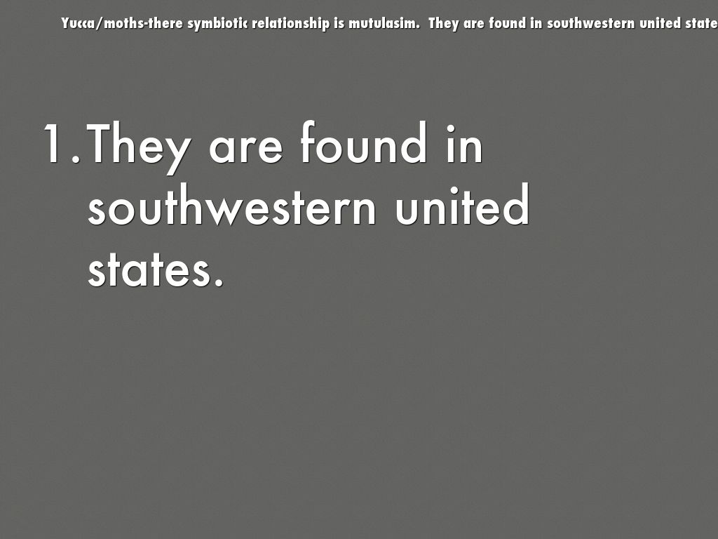 Yucca/moths-there symbiotic relationship is mutulasim. They are found in southwestern united states. Moths eat on yucca seeds because they do not live long. The role the yucca and moths play are they meet then lay eggs then go to an another flower the yucca provide fruit seed to the eggs.