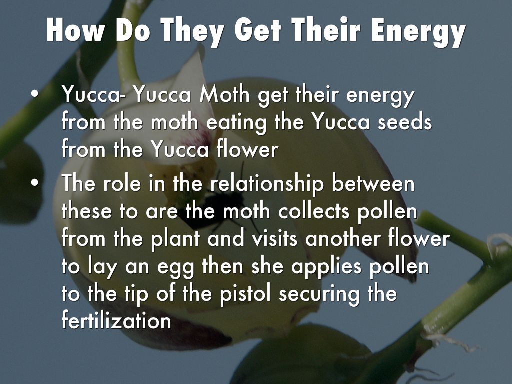 Yucca- Yucca Moth get their energy from the moth eating the Yucca seeds from the Yucca flower