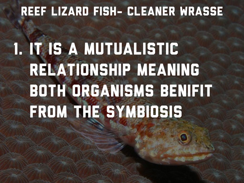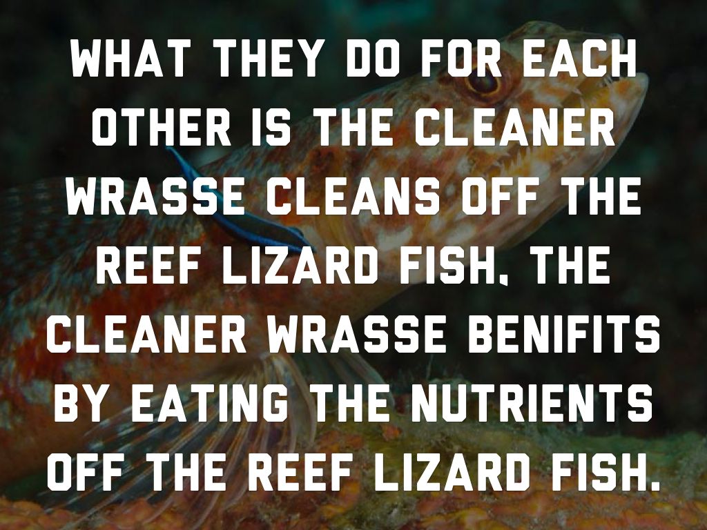 What they do for each other is the cleaner wrasse cleans off the reef lizard fish, the cleaner wrasse benifits by eating the nutrients off the reef lizard fish.
