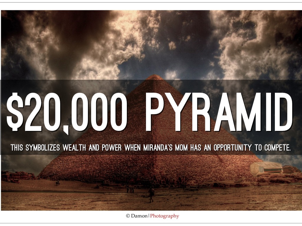 THIS SYMBOLIZES WEALTH AND POWER WHEN MIRANDA'S MOM HAS AN OPPORTUNITY TO COMPETE.