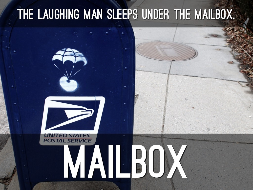 THE LAUGHING MAN SLEEPS UNDER THE MAILBOX.