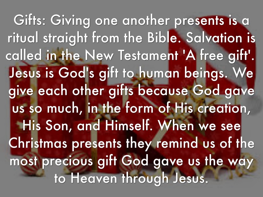 Gifts: Giving one another presents is a ritual straight from the Bible. Salvation is called in the New Testament 'A free gift'. Jesus is God's gift to human beings. We give each other gifts because God gave us so much, in the form of His creation, His Son, and Himself. When we see Christmas presents they remind us of the most precious gift God gave us the way to Heaven through Jesus.