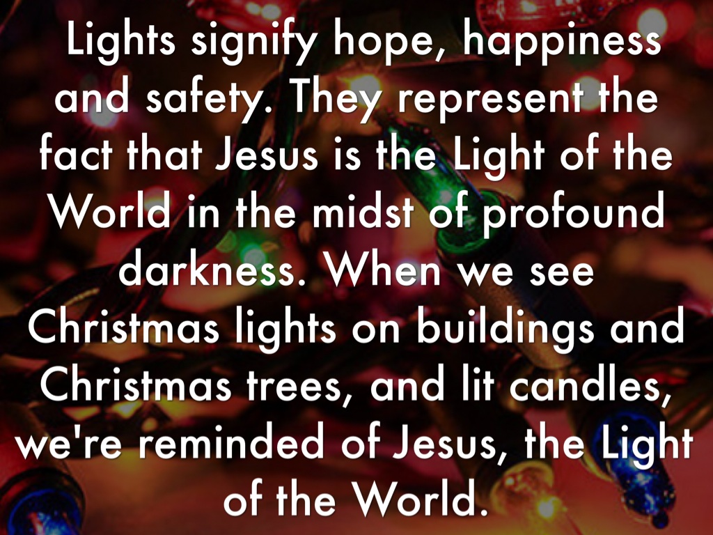 Lights signify hope, happiness and safety. They represent the fact that Jesus is the Light of the World in the midst of profound darkness. When we see Christmas lights on buildings and Christmas trees, and lit candles, we're reminded of Jesus, the Light of the World.