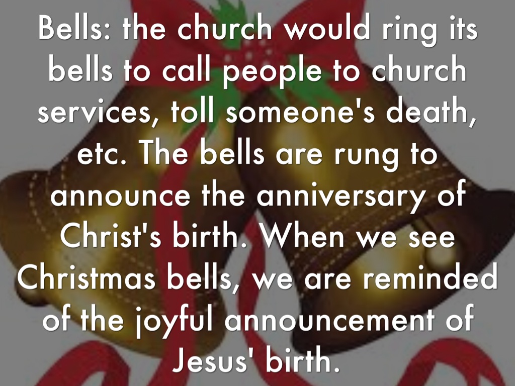 Bells: the church would ring its bells to call people to church services, toll someone's death, etc. The bells are rung to announce the anniversary of Christ's birth. When we see Christmas bells, we are reminded of the joyful announcement of Jesus' birth.