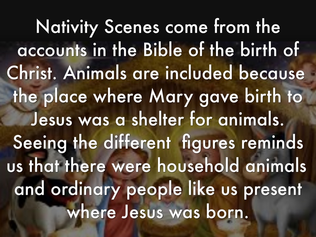 Nativity Scenes come from the accounts in the Bible of the birth of Christ. Animals are included because the place where Mary gave birth to Jesus was a shelter for animals.mSeeing the different creche figures reminds us that there were household animals and ordinary people like us present where Jesus was born.