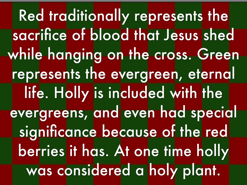 Red traditionally represents the sacrifice of blood that Jesus shed while hanging on the cross. Green represents the evergreen, eternal life. Holly is included with the evergreens, and even had special significance because of the red berries it has. At one time holly was considered a holy plant.