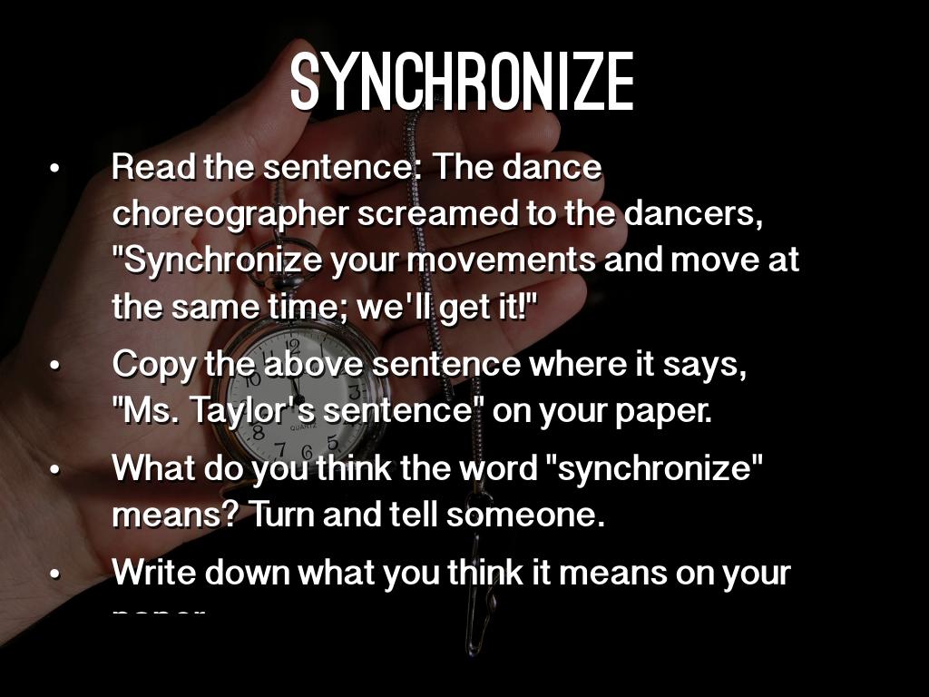 Read the sentence: The dance choreographer screamed to the dancers, "Synchronize your movements and move at the same time; we'll get it!"