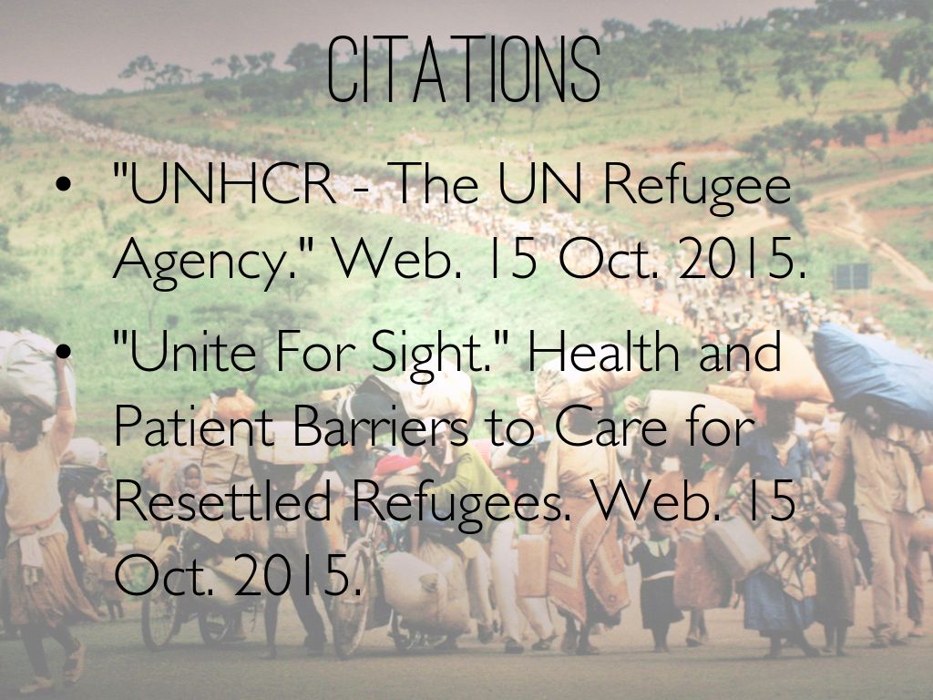 - "Unite For Sight." Health and Patient Barriers to Care for Resettled Refugees. Web. 15 Oct. 2015.
