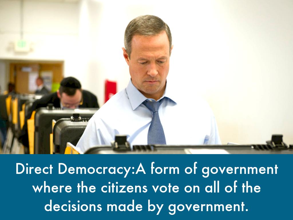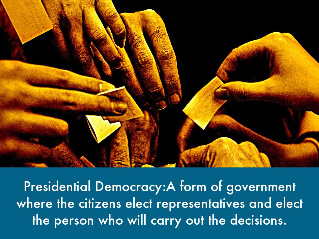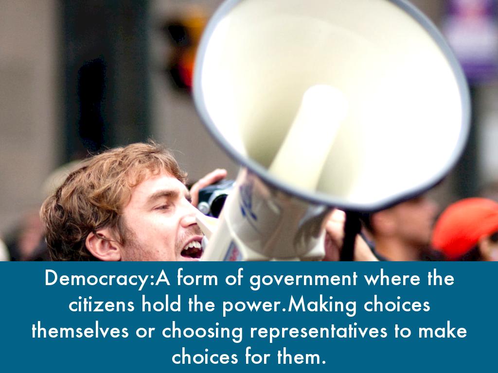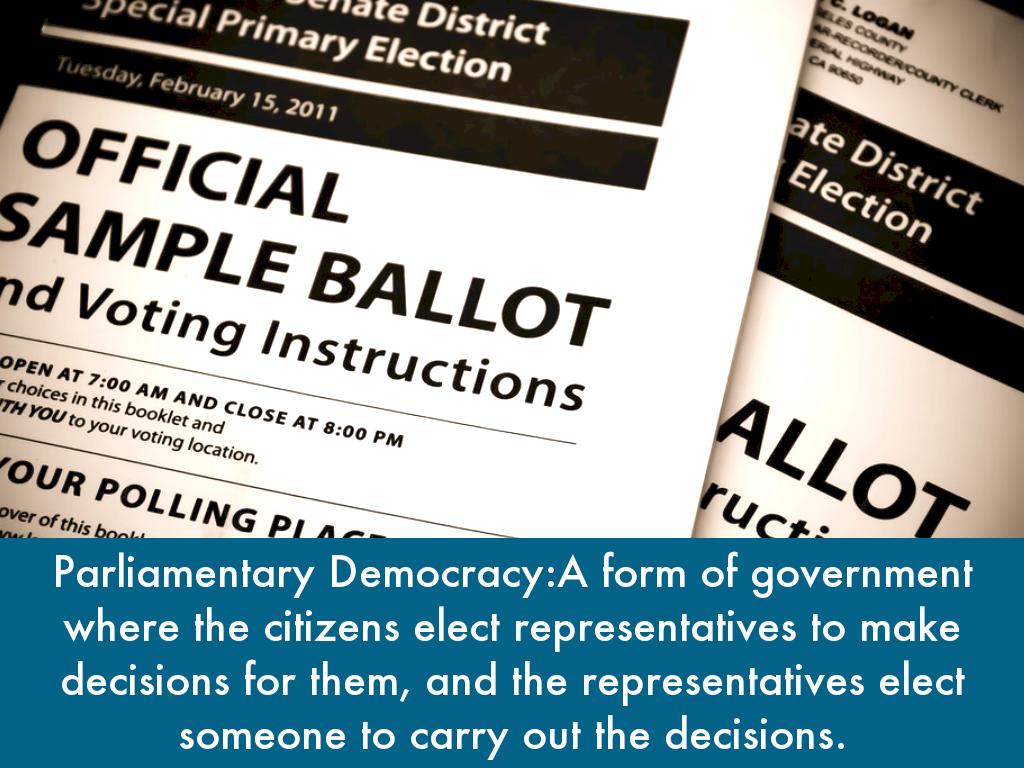 Parliamentary Democracy:A form of government where the citizens elect representatives to make decisions for them, and the representatives elect someone to carry out the decisions.
