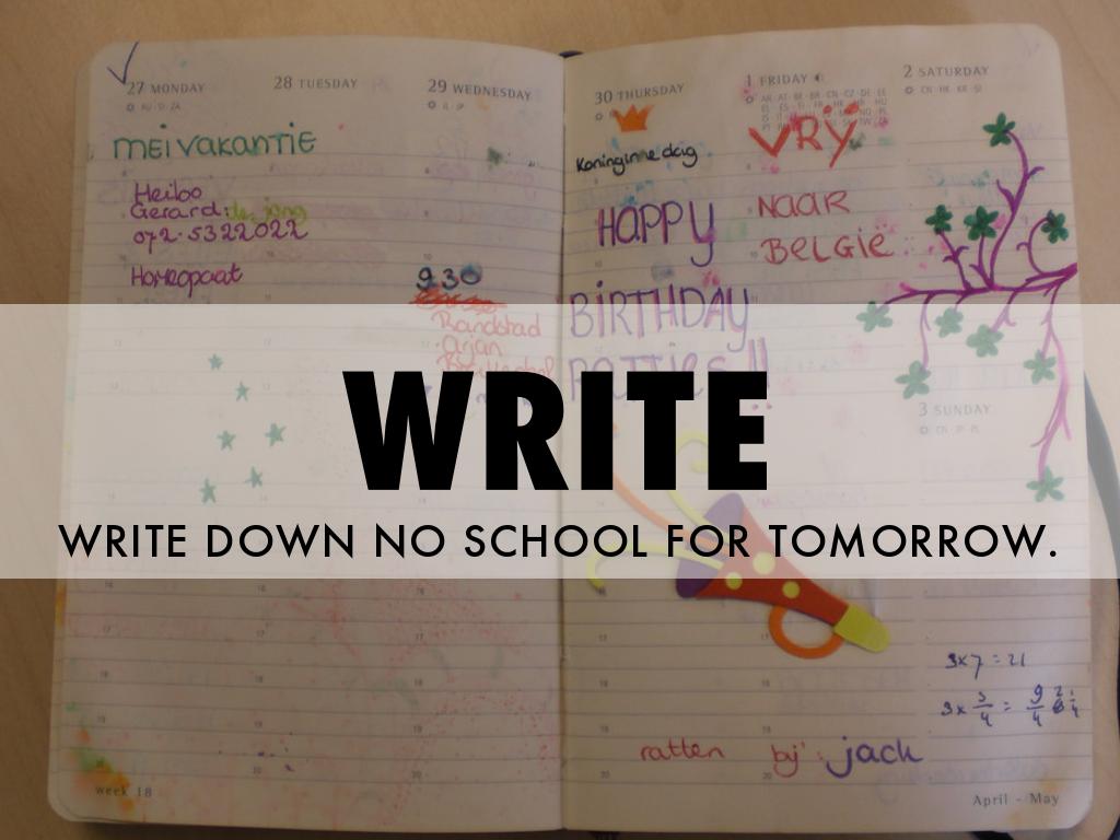 WRITE DOWN NO SCHOOL FOR TOMORROW.