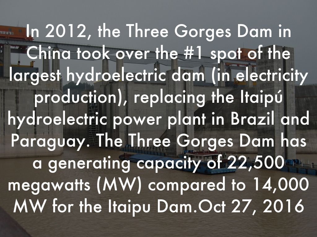 In 2012, the Three Gorges Dam in China took over the #1 spot of the largest hydroelectric dam (in electricity production), replacing the Itaipú hydroelectric power plant in Brazil and Paraguay. The Three Gorges Dam has a generating capacity of 22,500 megawatts (MW) compared to 14,000 MW for the Itaipu Dam.Oct 27, 2016