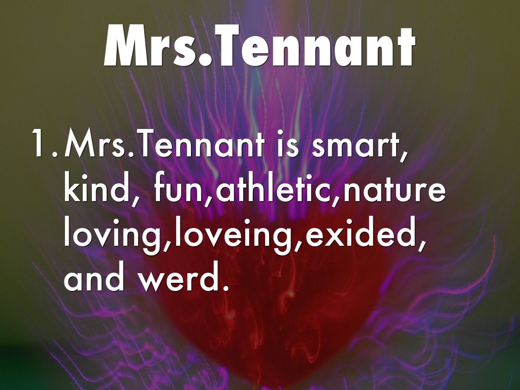 Mrs.Tennant is smart, kind, fun,athletic,nature loving,loveing,exided, and werd.