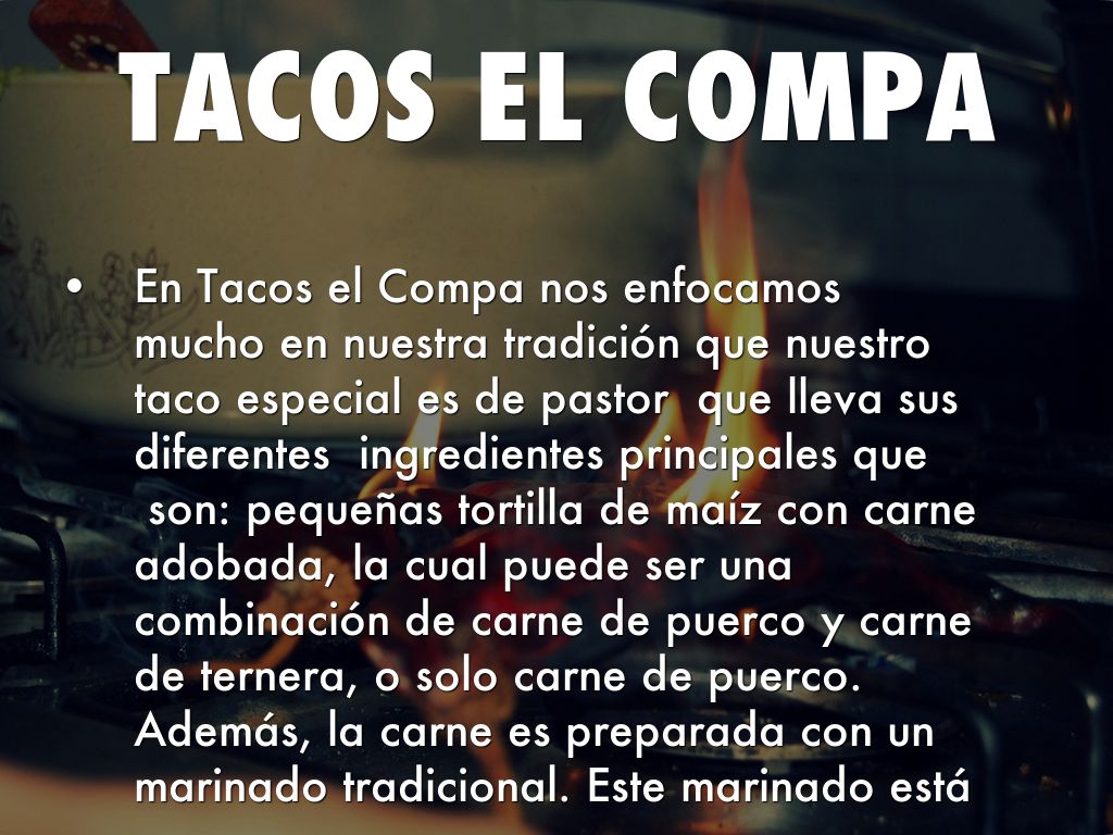 En Tacos el Compa nos enfocamos mucho en nuestra tradición que nuestro taco especial es de pastor que lleva sus diferentes ingredientes principales que son: pequeñas tortilla de maíz con carne adobada, la cual puede ser una combinación de carne de puerco y carne de ternera, o solo carne de puerco. Además, la carne es preparada con un marinado tradicional. Este marinado está hecho con ingredientes como el achiote, especias y chiles rojos molidos, que le dan un color rojizo muy característico a la carne, y son acompañados con una variedad de salsas, cilantro, cebolla y piña. La popularidad de este platillo es tal, que resulta del agrado de personas de todas las clases sociales.