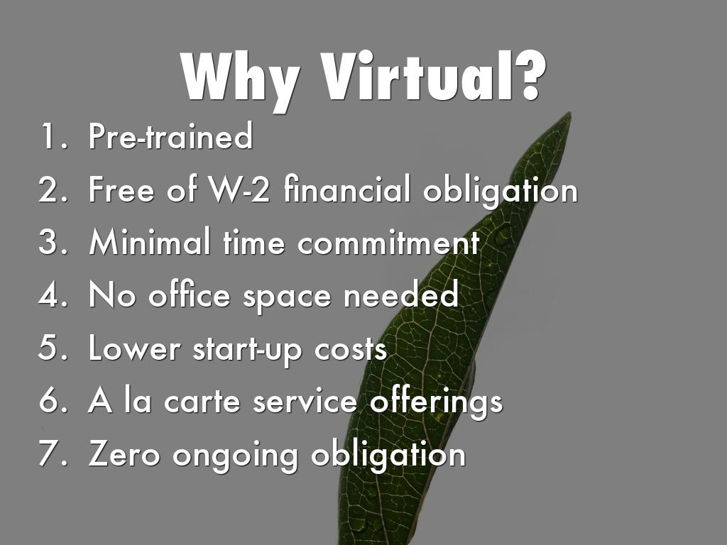 These are pre-trained administrative professionals who can be used for a variety of support services. This service allows you to lift the administrative burden off of you the rep, while also not carrying a W-2 employee on your payroll. Working with a virtual requires no office space, no startup costs like buying a computer or phone and allows you to tap into services as you need them, with no ongoing obligation.
