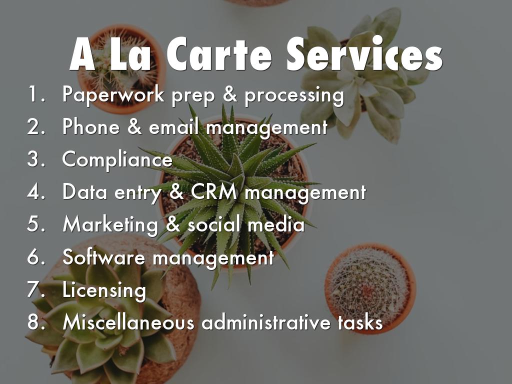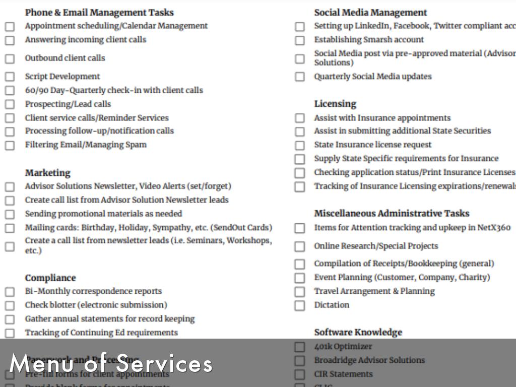 This is a sample of our Menu of Services, so you can see the list of options to utilize services is wide ranging.