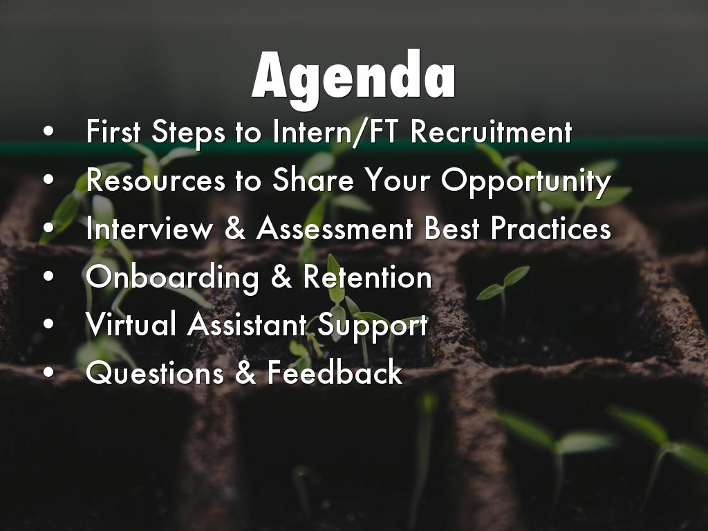 The Internship Best Practices Guide provides other suggestions on onboarding, retention and conversion to FT roles in the future.