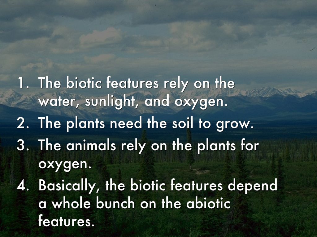 - The biotic features rely on the water, sunlight, and oxygen.