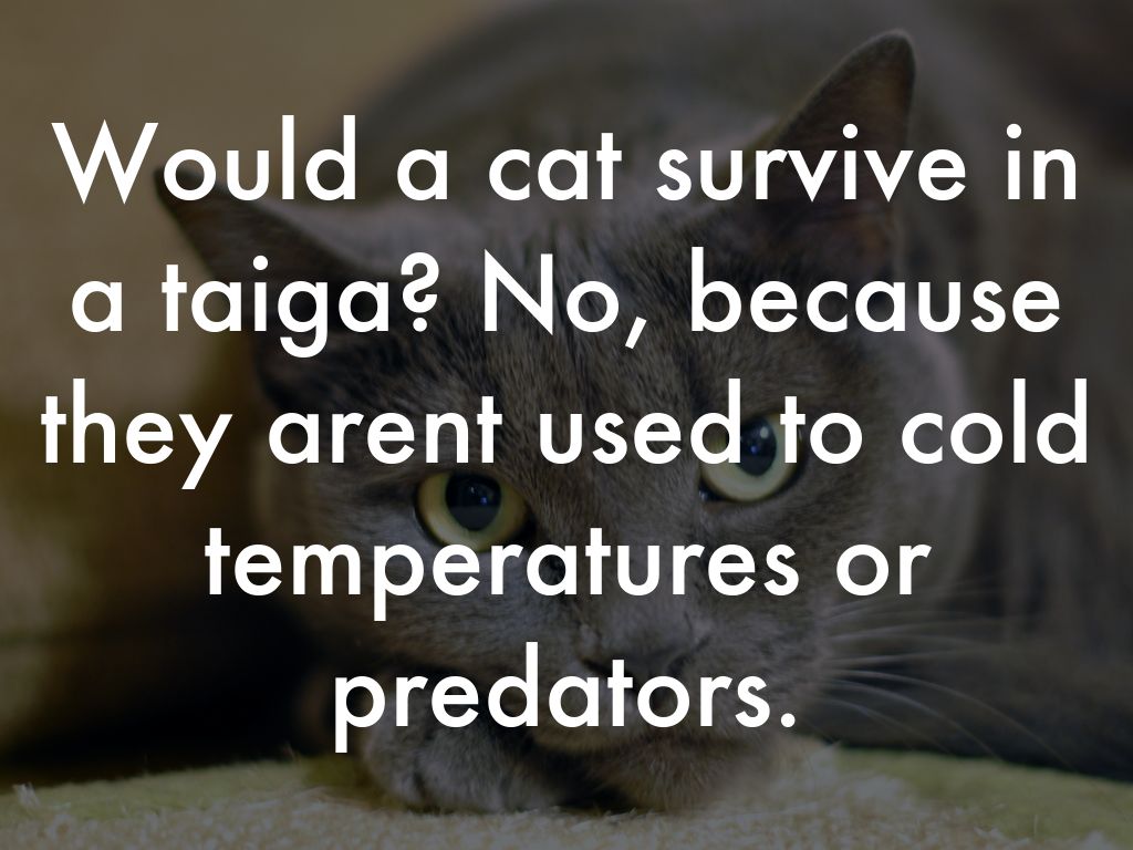 Would a cat survive in a taiga? No, because they arent used to cold temperatures or predators.