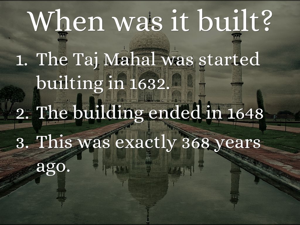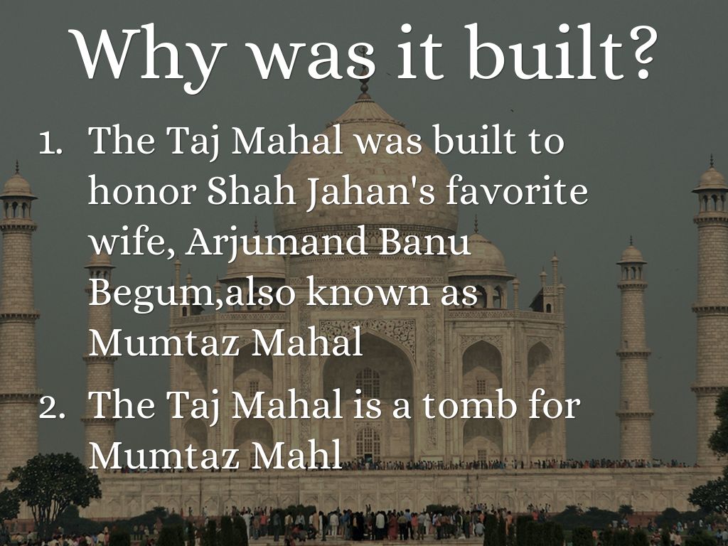The Taj Mahal was built to honor Shah Jahan's favorite wife, Arjumand Banu Begum,also known as Mumtaz Mahal