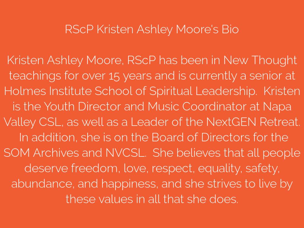 Kristen Ashley Moore, RScP has been in New Thought teachings for over 15 years and is currently a senior at Holmes Institute School of Spiritual Leadership. Kristen is the Youth Director and Music Coordinator at Napa Valley CSL, as well as a Leader of the NextGEN Retreat. In addition, she is on the Board of Directors for the SOM Archives and NVCSL. She believes that all people deserve freedom, love, respect, equality, safety, abundance, and happiness, and she strives to live by these values in all that she does.