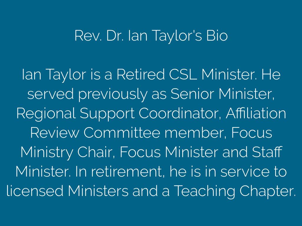 Ian Taylor is a Retired CSL Minister. He served previously as Senior Minister, Regional Support Coordinator, Affiliation Review Committee member, Focus Ministry Chair, Focus Minister and Staff Minister. In retirement, he is in service to licensed Ministers and a Teaching Chapter.