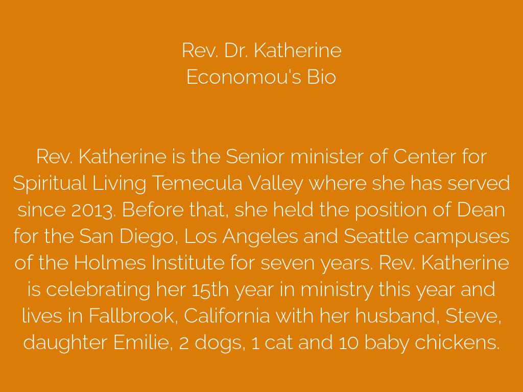 Rev. Katherine is the Senior minister of Center for Spiritual Living Temecula Valley where she has served since 2013. Before that, she held the position of Dean for the San Diego, Los Angeles and Seattle campuses of the Holmes Institute for seven years. Rev. Katherine is celebrating her 15th year in ministry this year and lives in Fallbrook, California with her husband, Steve, daughter Emilie, 2 dogs, 1 cat and 10 baby chickens.