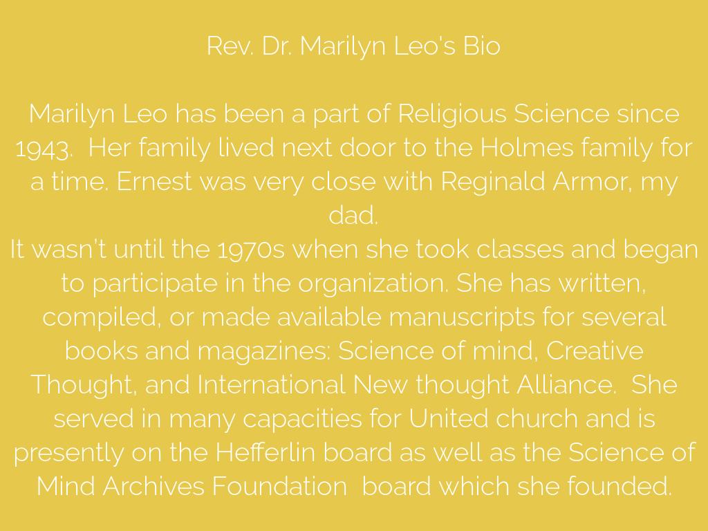 Marilyn Leo has been a part of Religious Science since 1943. Her family lived next door to the Holmes family for a time. Ernest was very close with Reginald Armor, my dad.