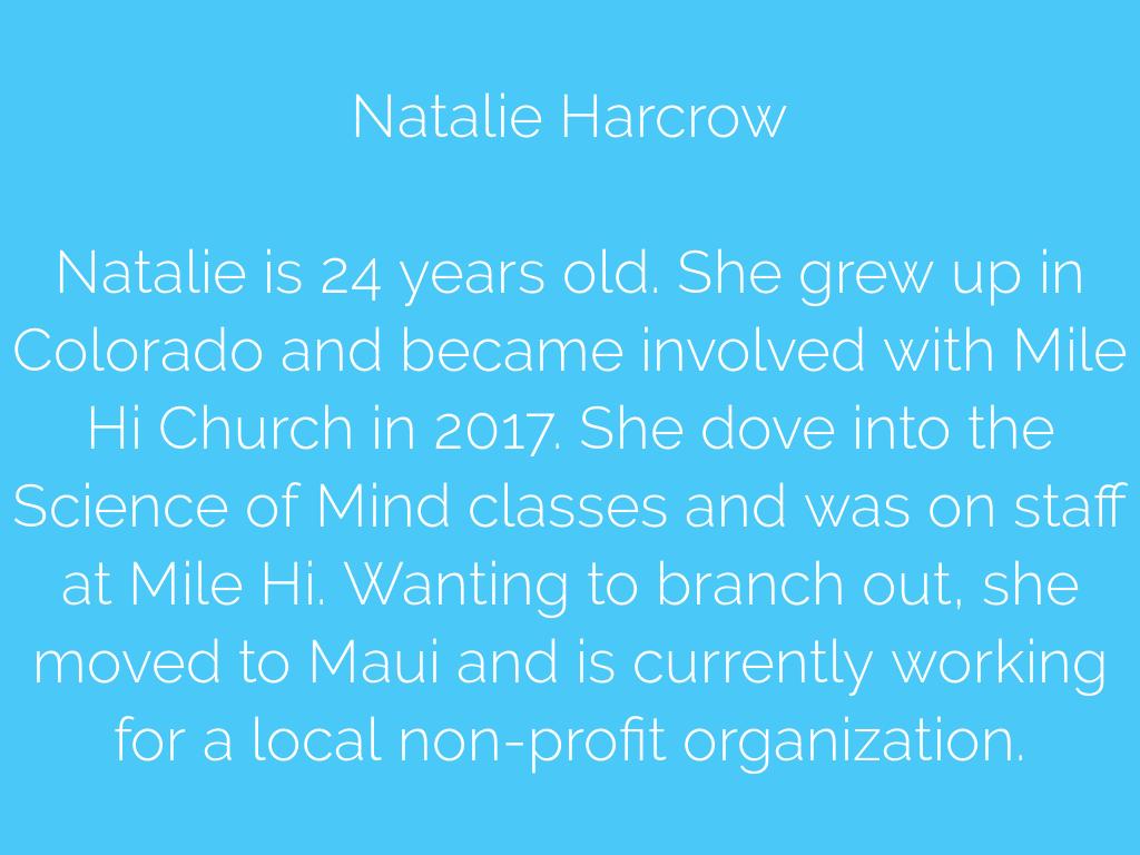 Natalie is 24 years old. She grew up in Colorado and became involved with Mile Hi Church in 2017. She dove into the Science of Mind classes and was on staff at Mile Hi. Wanting to branch out, she moved to Maui and is currently working for a local non-profit organization.