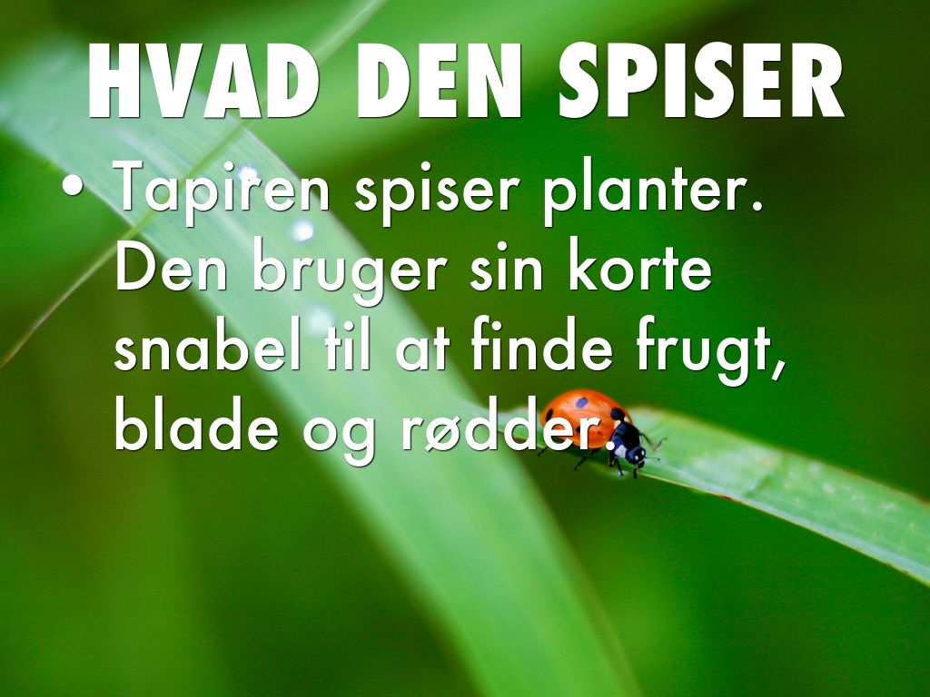 Tapiren spiser planter. Den bruger sin korte snabel til at finde frugt, blade og rødder.