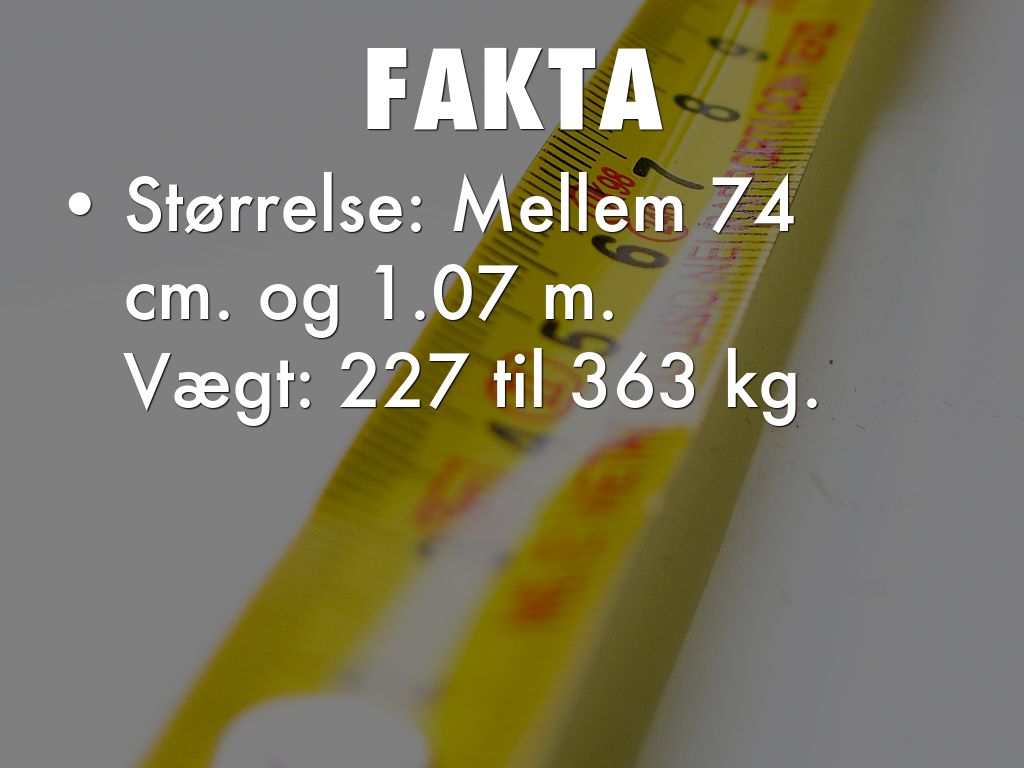 Størrelse: Mellem 74 cm. og 1.07 m. Vægt: 227 til 363 kg.