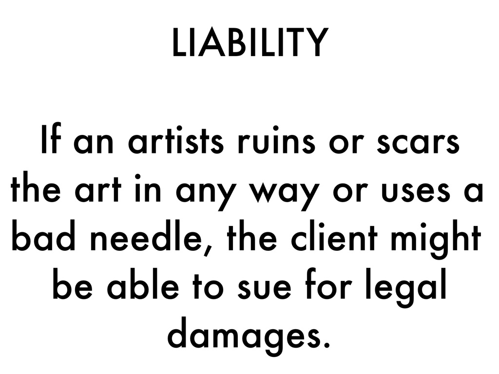 If an artists ruins or scars the art in any way or uses a bad needle, the client might be able to sue for legal damages.