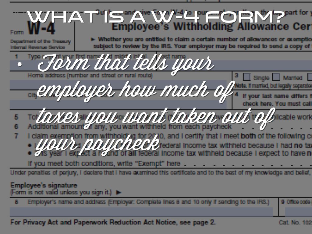 • Form that tells your employer how much of taxes you want taken out of your paycheck