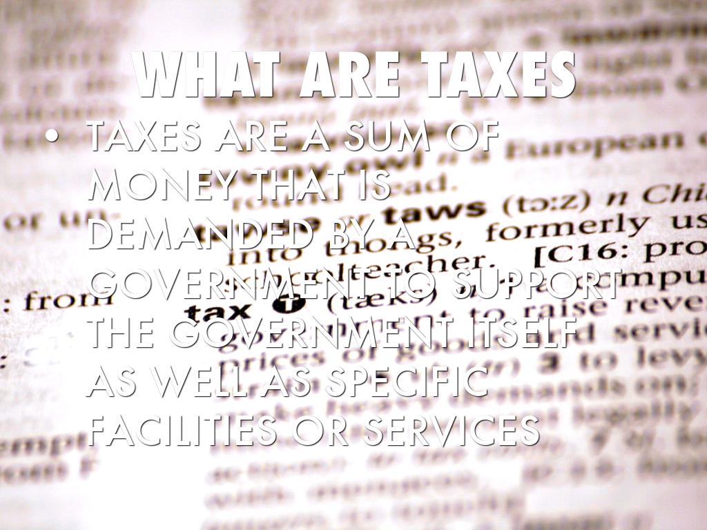 TAXES ARE A SUM OF MONEY THAT IS DEMANDED BY A GOVERNMENT TO SUPPORT THE GOVERNMENT ITSELF AS WELL AS SPECIFIC FACILITIES OR SERVICES